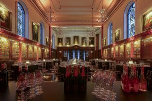 The Inner Temple provides a setting that requires little additional styling, with silvered chandeliers, stained glass and oak-panelled interiors creating a strong seasonal atmosphere.