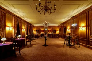 For evening events in the Hall, the atmosphere deepens as daylight fades and chandeliers illuminate the room, creating a striking setting for speeches and toasts.